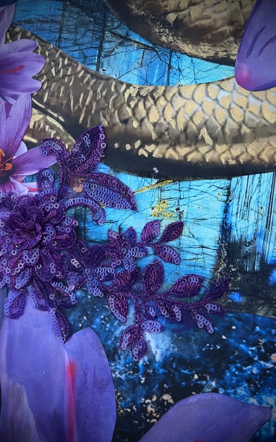 This artwork unfolds on a canvas where the aurora borealis dances with galactic nebulae, painted in swirling acrylics of deep cobalt, light blues, and violet. From this celestial ceiling, indigo and purple flowers appear to rain down, their forms layered with pieces of sequined floral fabric, photographs of flowers associated with the third eye, and delicate washes of paint, creating a textured, dreamlike tapestry.
