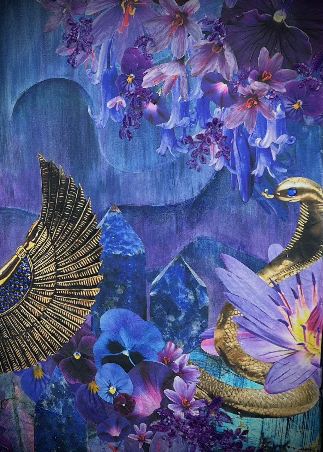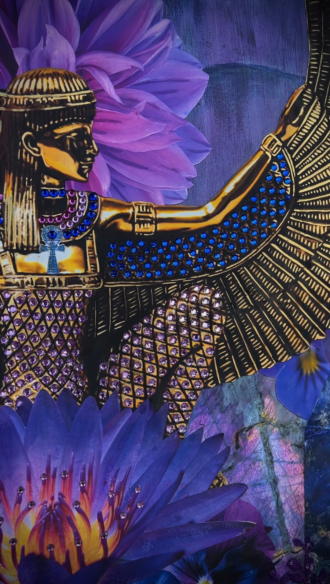 "Indigo Isis" is more than a depiction; it is an invocation. The layered photos, tangible fabrics, and embedded crystals create a multi sensory experience that beckons you to lean closer, to see the textures, and decode the hidden teachings. It challenges the boundary between art and artifact, inviting you to connect with the archetype of Isis, not as a distant myth, but as a resonant frequency of magic, restoration, and supreme sovereignty that exists within everyone.
