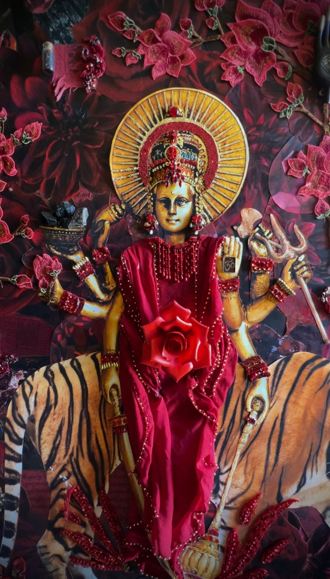 Here, the Goddess Durga emerges from a tapestry of reclaimed history and potent symbolism. A collage of painted crimson roses, burgundy blooms, and the grounding energy of smokey quartz points, anchor her fierce presence. Antique and thrifted objects, vintage textiles, sequins, embroidery, and found materials each with a past life, are layered into the collage around her.