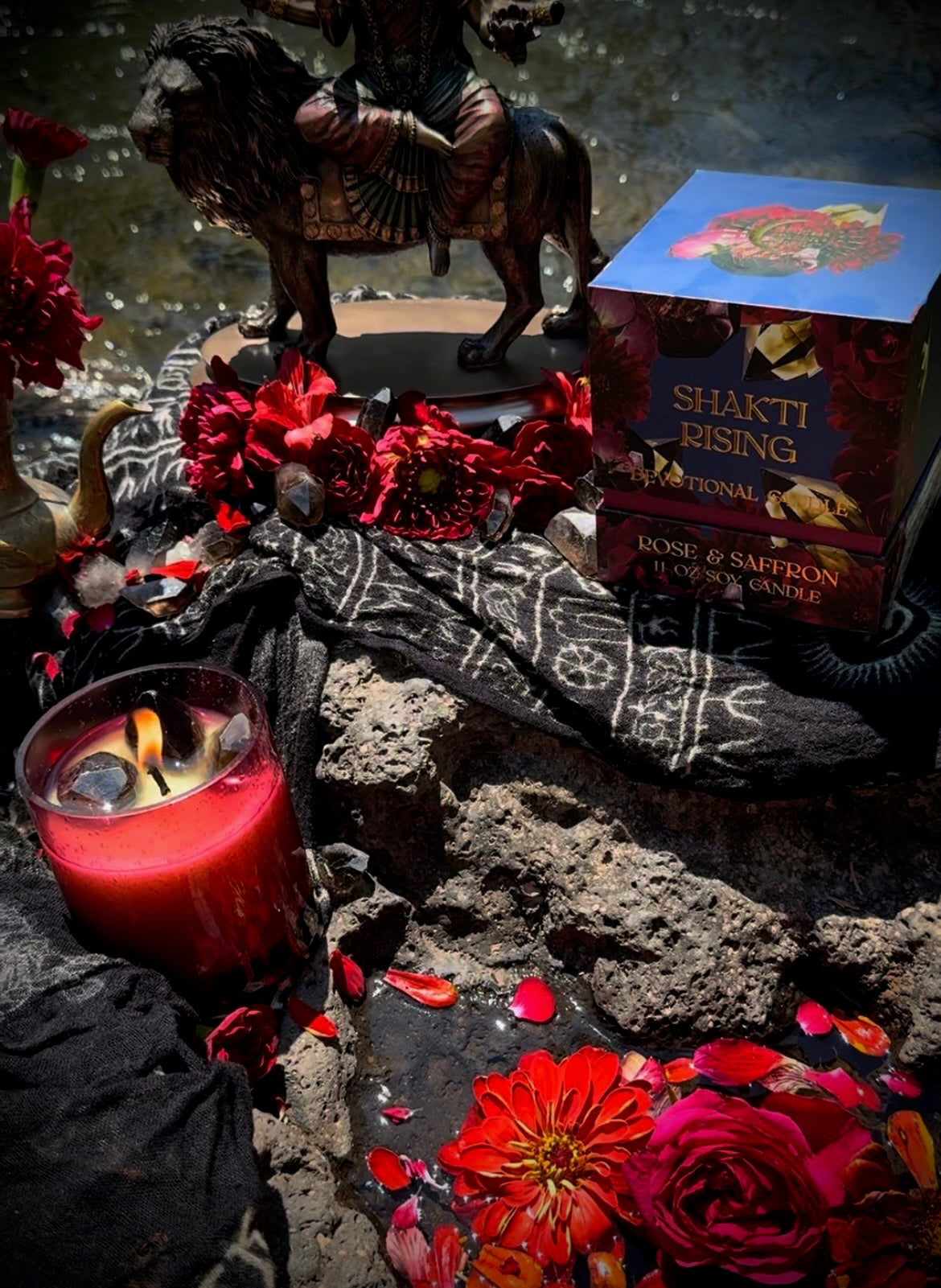 The Shakti Rising Candle is an invocation of the Goddess Durga, the fierce and nurturing embodiment of divine feminine power (Shakti). This candle is crafted to root you in your inherent strength, courage, and passion, helping you to overcome obstacles and rise into your most empowered self.